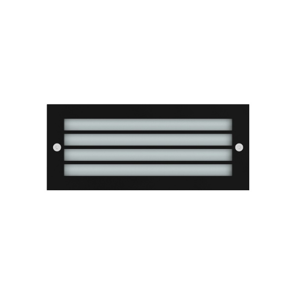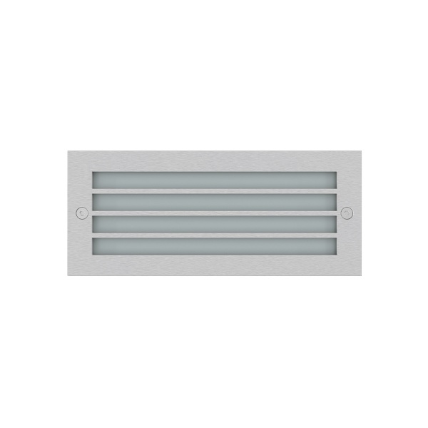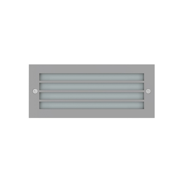 Luminária de encastrar de parede com aba de remate para aplicação em espaços exteriores, com projeção de luz frontal. Aro exterior e corpo em alumínio injetado. Caixa de encastrar não incluída.