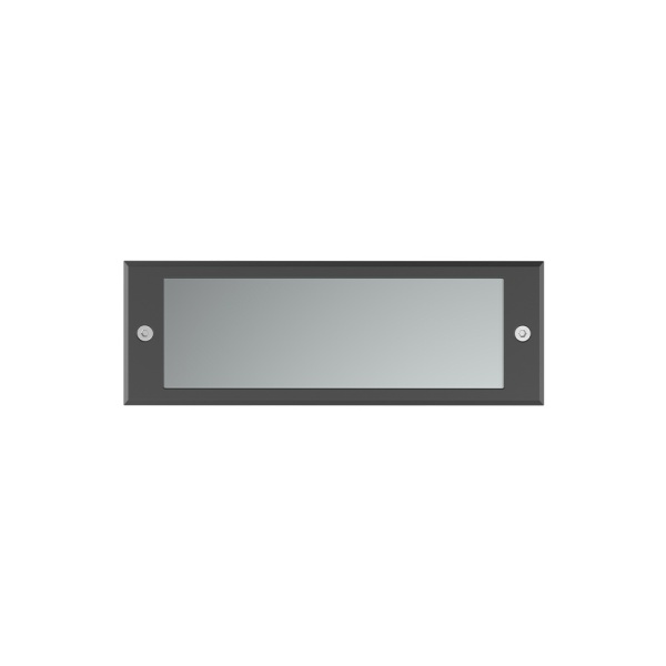 Luminária de encastrar de parede com aba de remate para aplicação em espaços exteriores, com projeção de luz frontal. Aro exterior e corpo em alumínio injetado. Difusor em policarbonato opalino. Caixa de encastrar incluída. Driver incorporado.