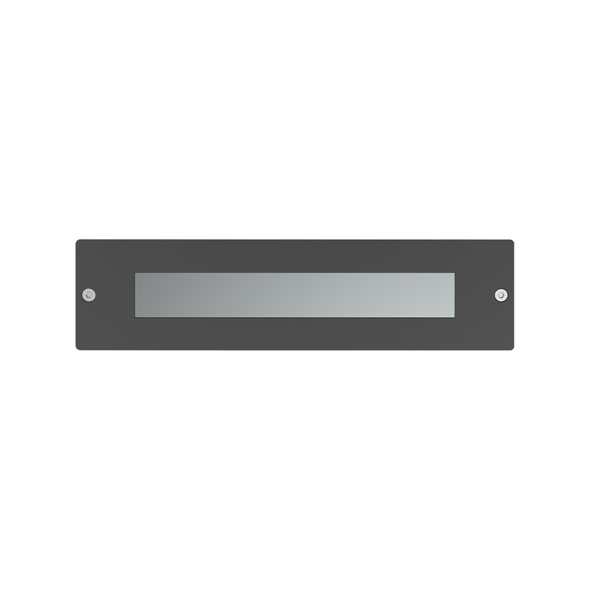 Luminária de encastrar de parede com aba de remate para aplicação em espaços exteriores, com projeção de luz frontal. Aro exterior e corpo em alumínio injetado. Caixa de encastrar não incluída.