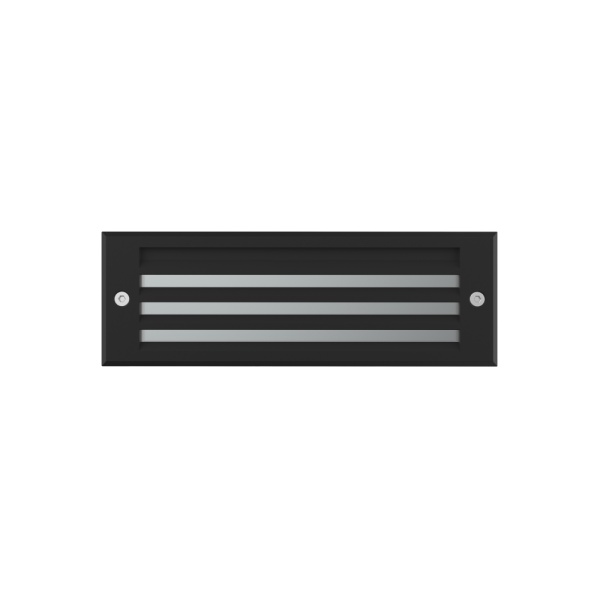 Luminária de encastrar de parede com aba de remate para aplicação em espaços exteriores, com projeção de luz frontal. Aro exterior e corpo em alumínio injetado. Difusor em policarbonato opalino. Caixa de encastrar incluída. Driver incorporado.