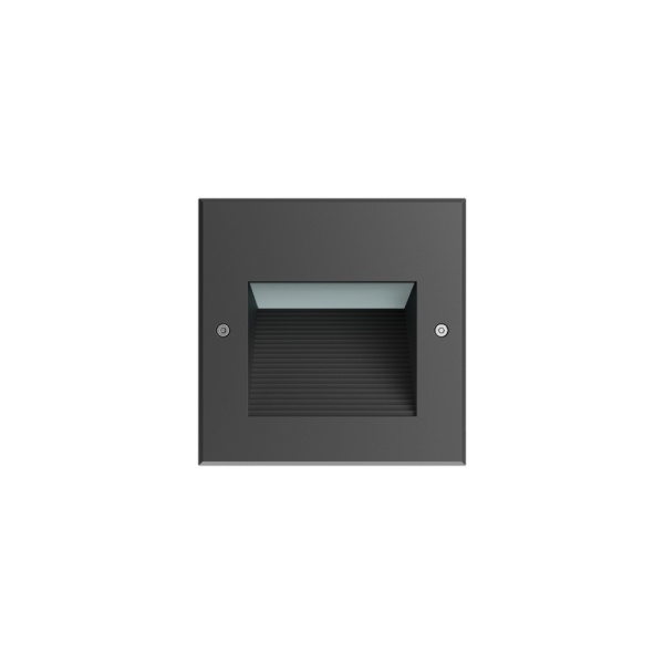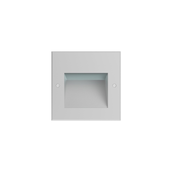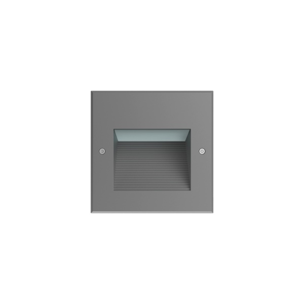 Luminária de encastrar de parede com aba de remate para aplicação em espaços exteriores, com projeção de luz frontal. Aro em alumínio fundido pintado. Corpo em alumínio injetado. Vidro fosco de proteção incluído. Driver incorporado. Caixa de encastrar incluída.