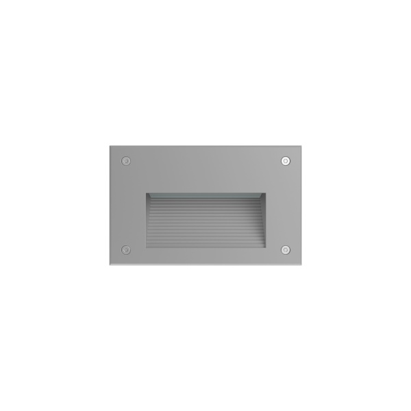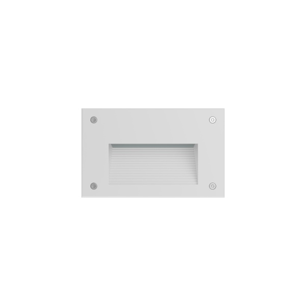Luminária de encastrar de parede com aba de remate para aplicação em espaços exteriores, com projeção de luz frontal. Aro em alumínio fundido pintado. Corpo em alumínio injetado. Vidro fosco de proteção incluído. Driver incorporado. Caixa de encastrar incluída.