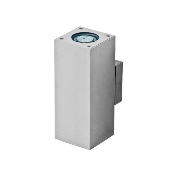Luminária saliente de parede para aplicação em espaços exteriores, com projeção de luz descendente e ascendente. Corpo em alumínio ou aço inox 316. Vidro de proteção incluído.