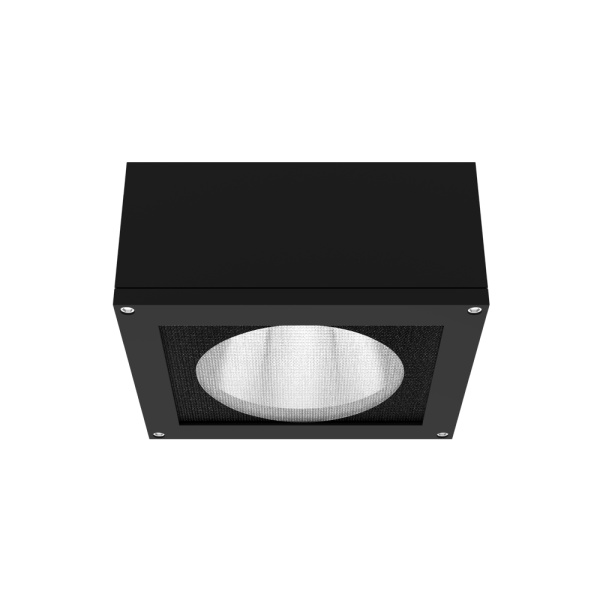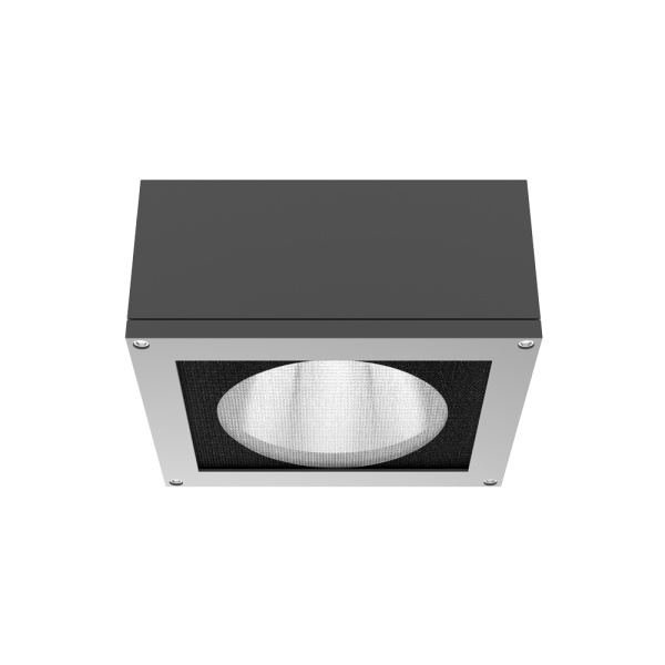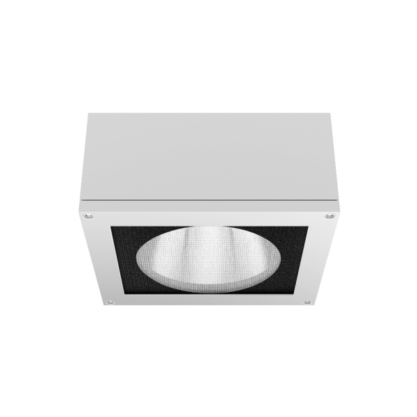 Luminária saliente para aplicação em espaços exteriores, com projeção de luz descendente. Corpo em alumínio. Difusor prismático.