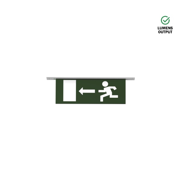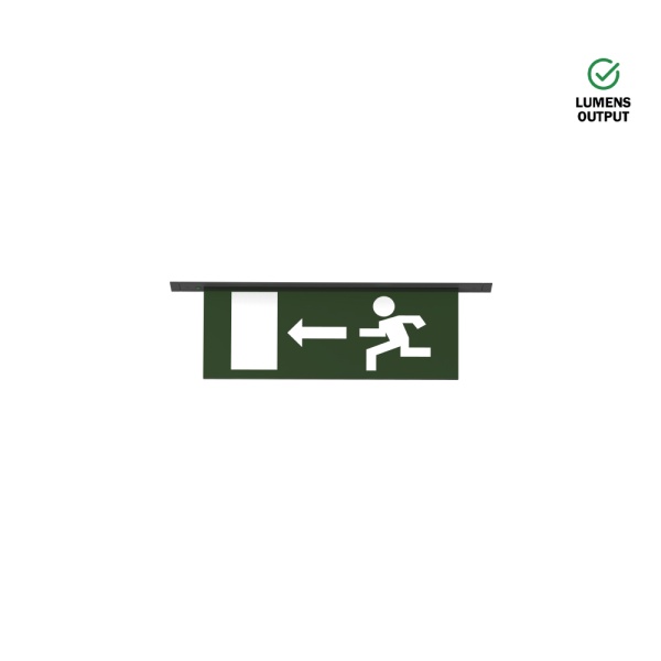 Luminária de emergência de encastrar com aba de remate, para aplicação em espaços interiores, com projeção de luz descendente. Corpo em alumínio injetado com possibilidade de pintura em diversas cores. Difusor em acrílico com pictograma à escolha. Driver incorporado.