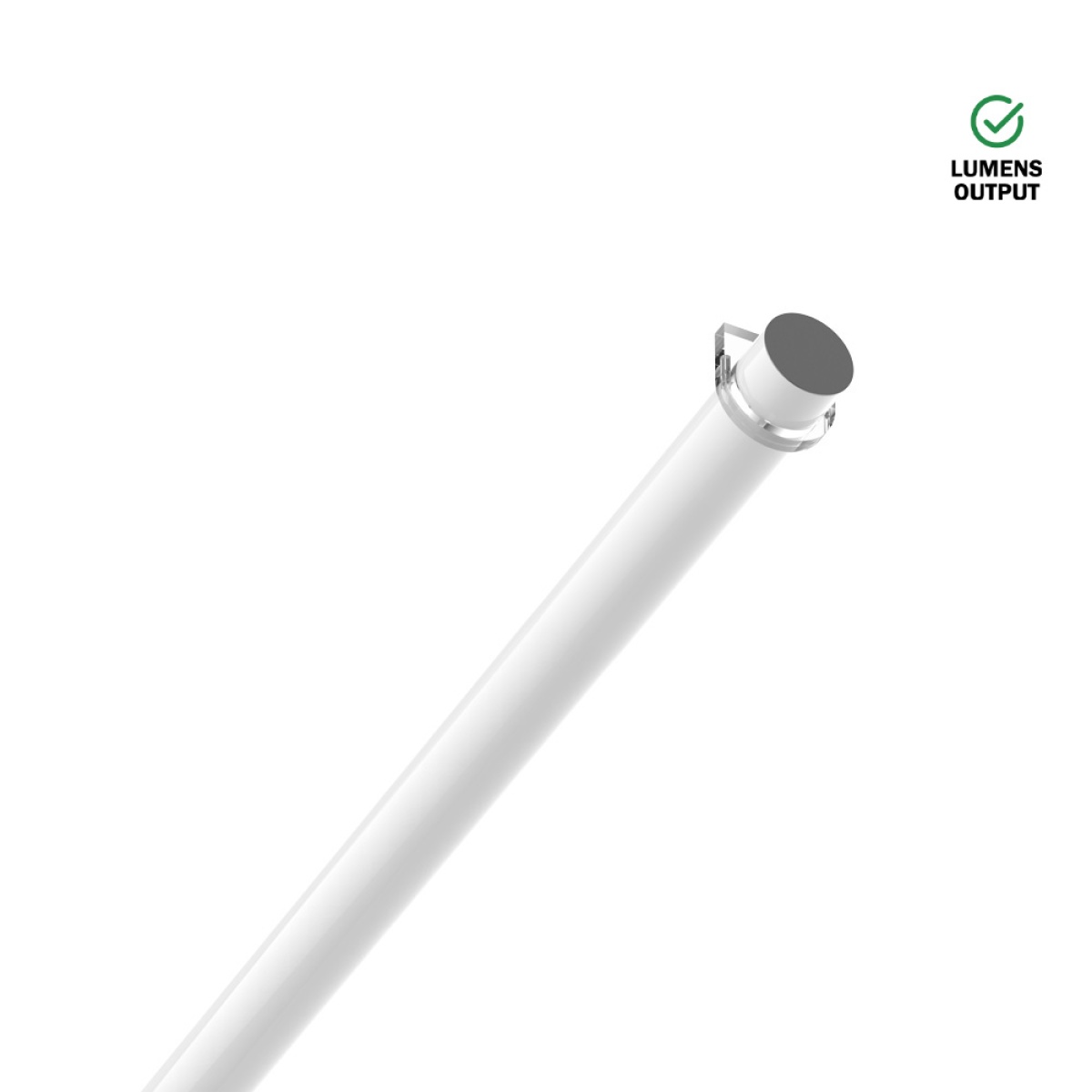 Luminária tubular saliente para aplicação no teto ou na parede. Projeção de luz 360º. Difusor em policarbonato e topos em alumínio pintado. Driver remoto.