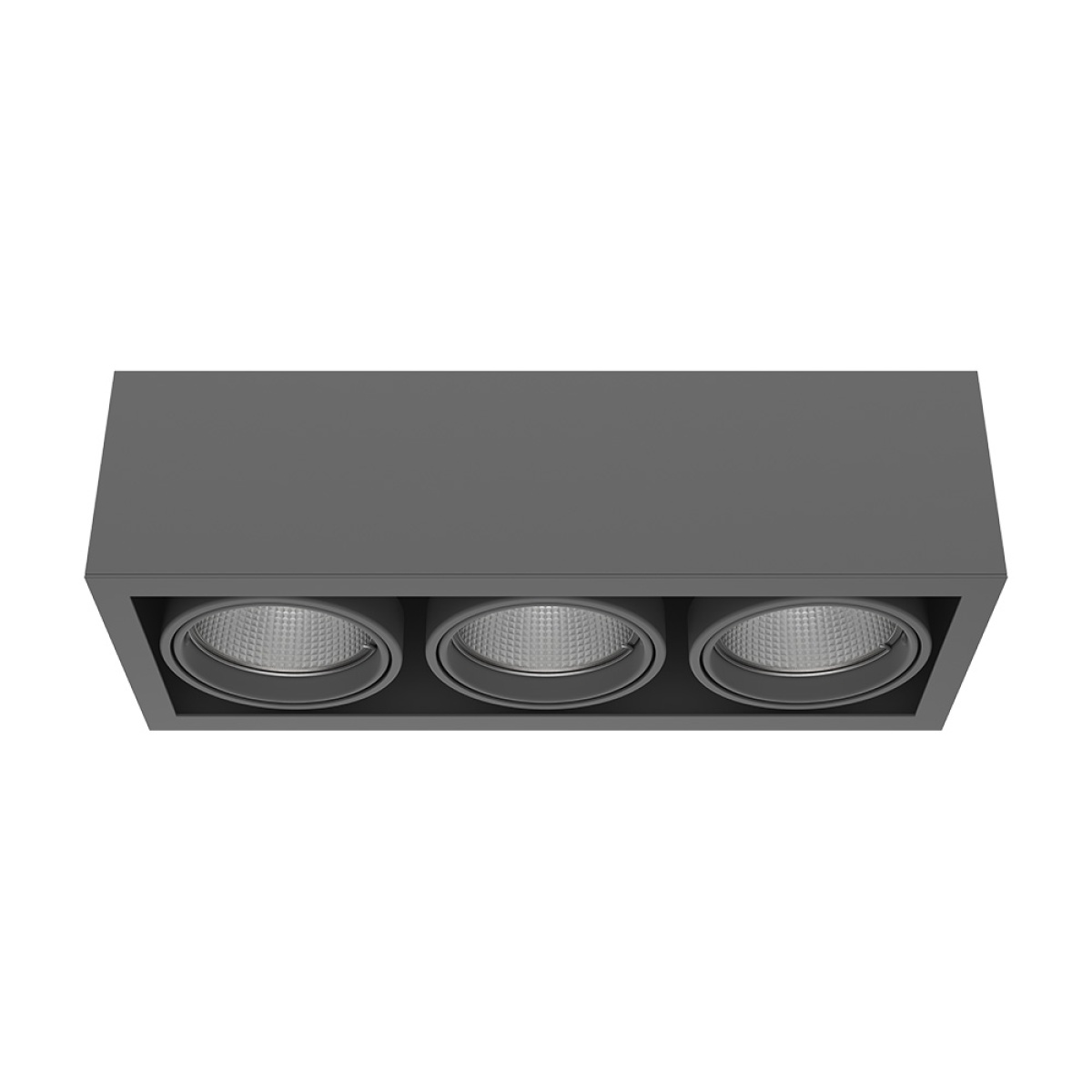 Luminária saliente de teto para aplicação em espaços interiores, com projeção de luz orientável. Corpo em aço inox escovado ou pintado.