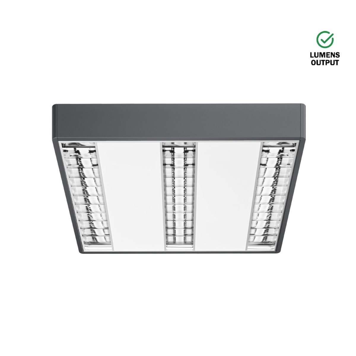 Luminária saliente para aplicação em espaços interiores, com projeção de luz descendente. Corpo em chapa galvanizada com possibilidade de pintura em diversas cores. Difusor em alumínio brilhante. Driver incorporado.