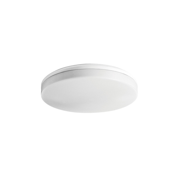 Luminária saliente de teto para aplicação em espaços interiores, com projeção de luz descendente. Corpo em policarbonato.