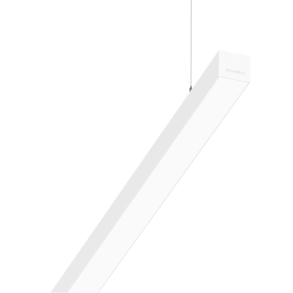 Luminária suspensa para aplicação em espaços interiores, com projeção de luz descendente. Corpo em alumínio extrudido com possibilidade de pintura em diversas cores. Difusor em policarbonato. Driver incorporado. Florão standard: saliente redondo.