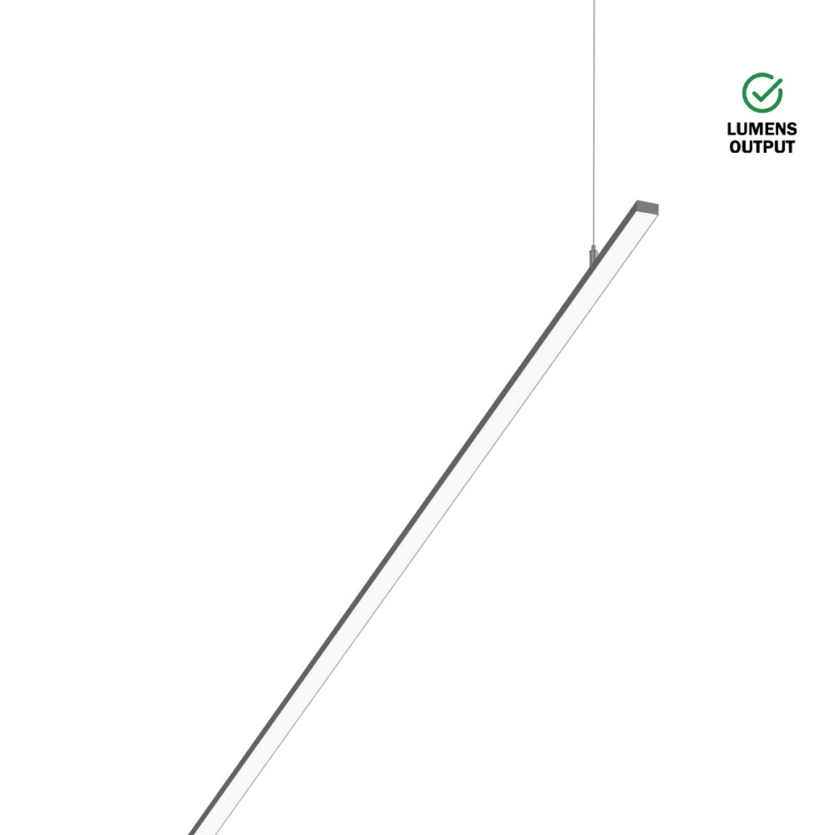 Luminária suspensa para aplicação em espaços interiores, com projeção de luz descendente. Corpo em alumínio extrudido com possibilidade de pintura em diversas cores. Difusor em policarbonato opalino, opalino saliente ou black. Driver remoto.