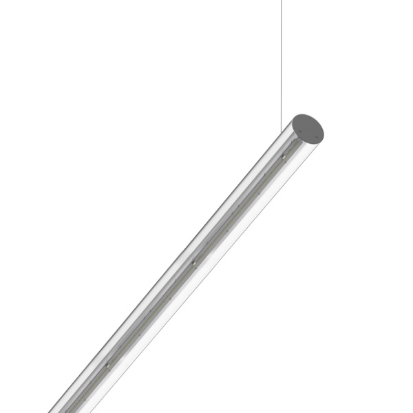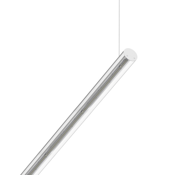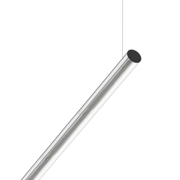 Horizontally suspended tubular luminaire in polycarbonate. Downward light projection. Incorporated driver.