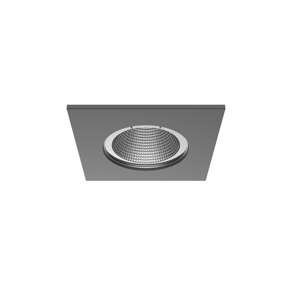 Recessed trim luminaire for indoor application, with downward light projection. Exterior rim in brushed or painted stainless steel.