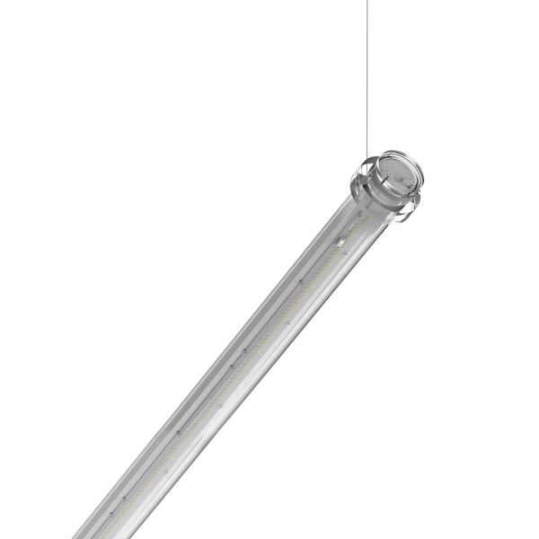 Luminaria tubular suspendida horizontalmente en policarbonato. Proyección de luz descendente. Driver incorporado.
