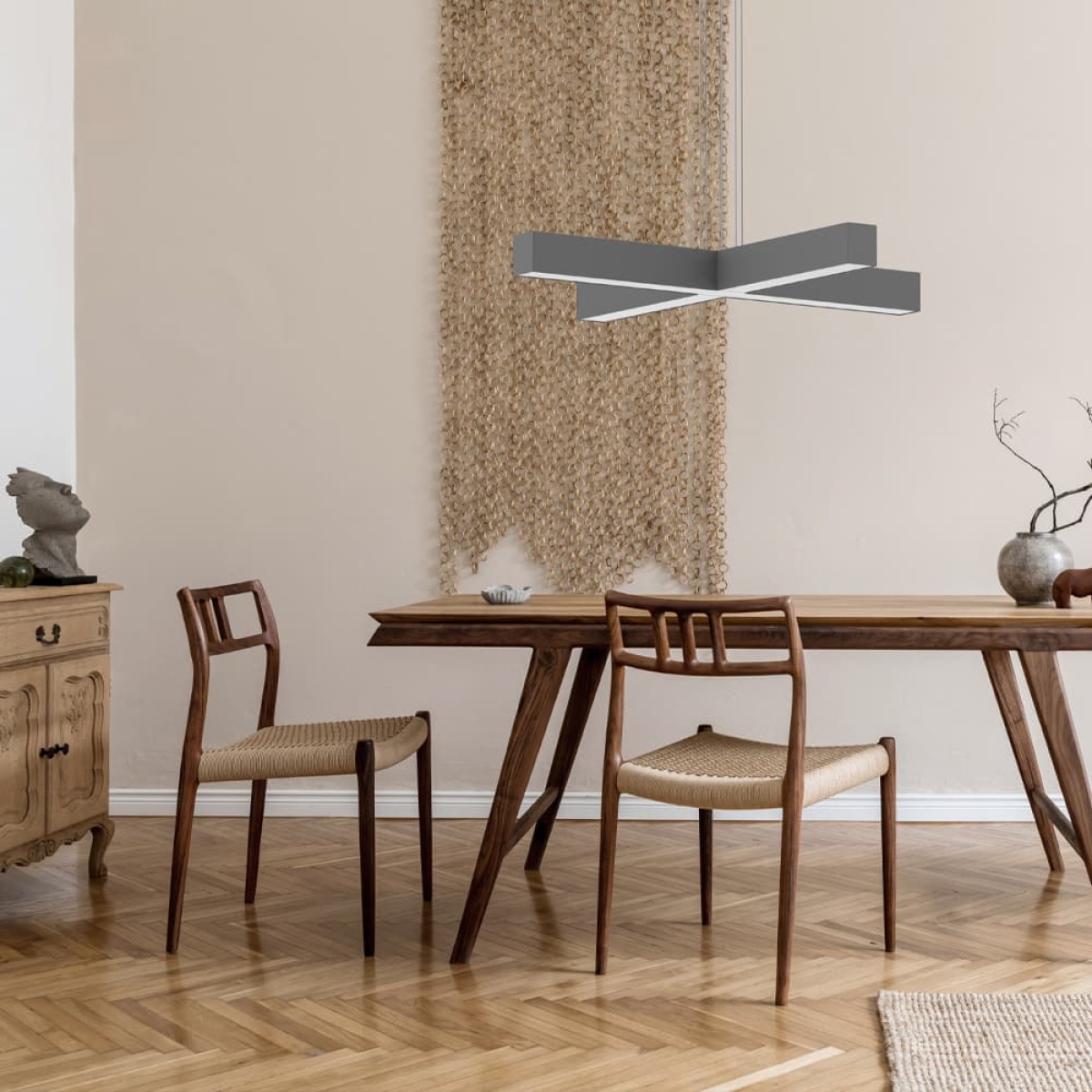 Luminaria suspendida para aplicación interior, con proyección de luz descendente. Cuerpo de aluminio extruido con posibilidad de pintar en diferentes colores. Difusor en policarbonato opal, prismatico o negro. Driver incorporado. Florón estándar: superficie redondo.