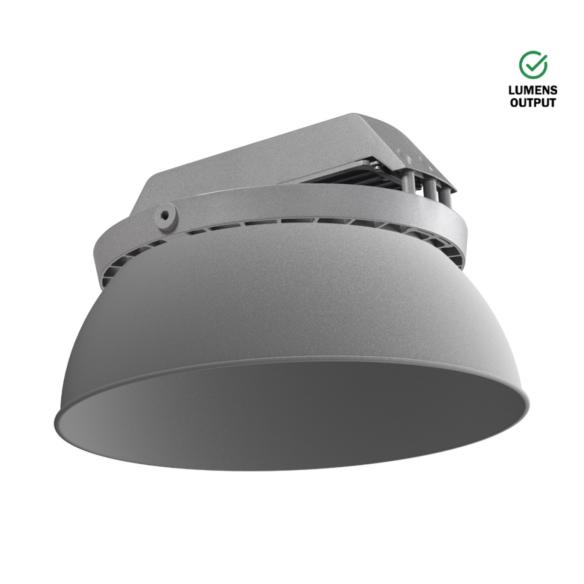Luminaria suspendida para aplicación en áreas industriales y comerciales, con proyección de luz descendente. Cuerpo de aluminio inyectado. Difusor transparente. Cable de suspensión no incluido. Driver incorporado.