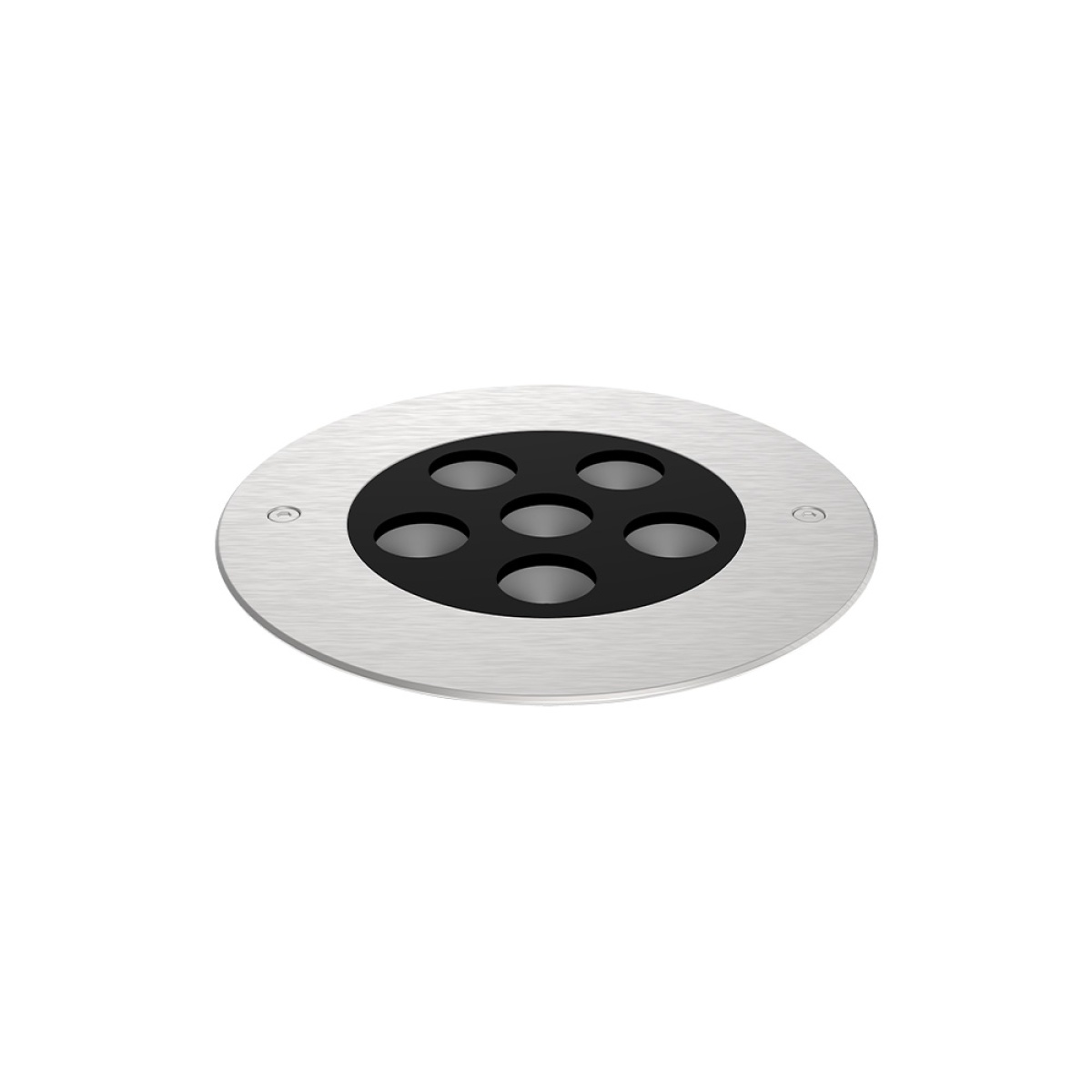 Luminaire encastré de sol avec cadre pour application extérieur, avec projection de lumière ascendant. Collorette extérieur en acier inoxydable. Corps en aluminium injecté. Verre trempé. Driver intégré. Cette installation nécessite un espace de drainage avec gravier avec au moins 20 cm.