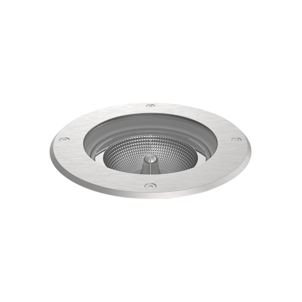 Luminaire encastré de sol avec cadre pour application extérieur, avec projection de lumière ascendant. Collorette extérieur en acier inoxydable. Corps en polyamide. Verre trempé. Boite d’encastrement en polyamide. Cette installation nécessite un espace de drainage avec gravier avec au moins 20 cm.