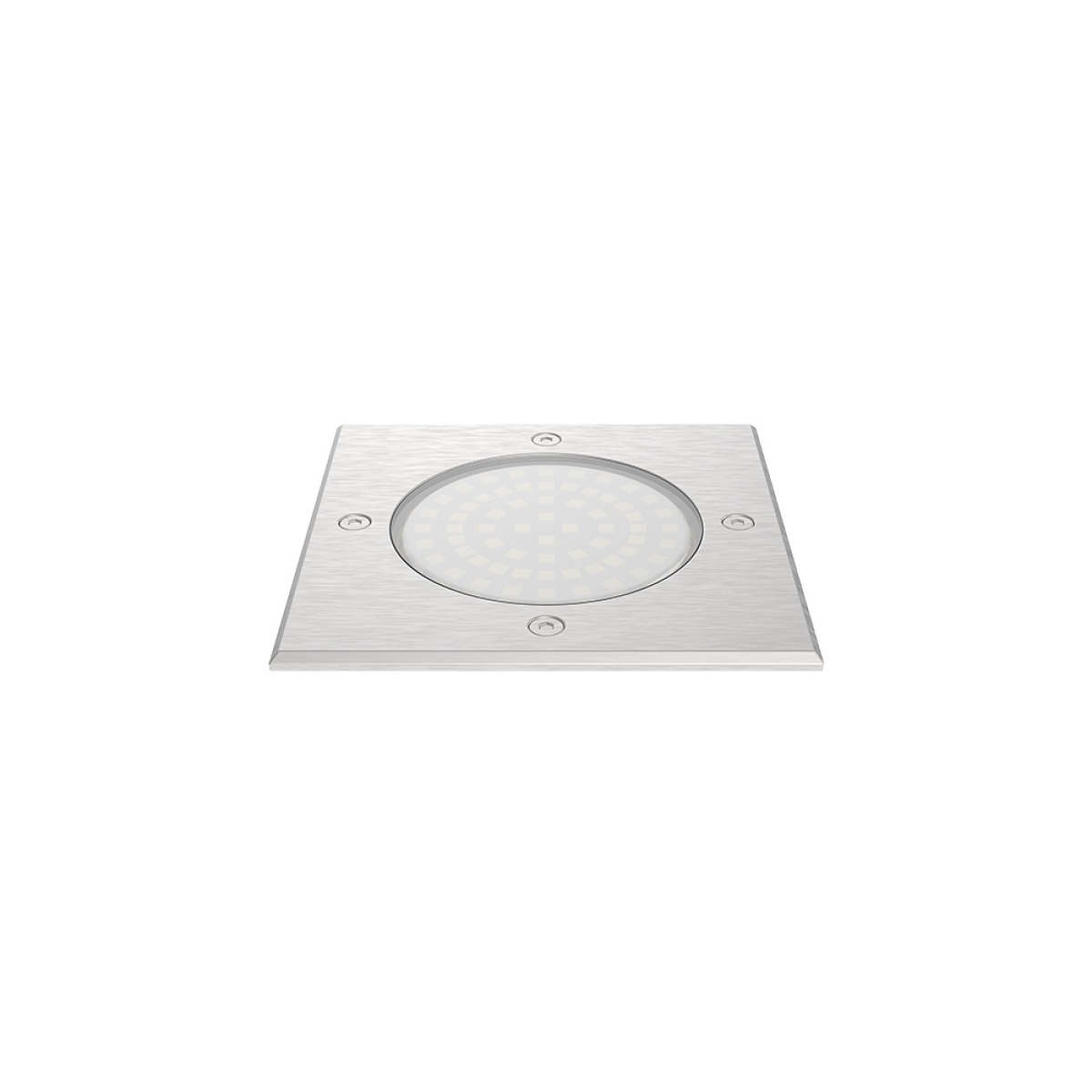 Luminaire encastré du sol avec cadre pour application extérieur, avec projection de lumière ascendant. Collorette extérieur en acier inoxydable 316 L. Corps en aluminium injecté. Verre trempé. Driver intégré. Boîte d’encastrement en PVC inclus. Cette installation nécessite un espace de drainage avec gravier avec au moins 20 cm.