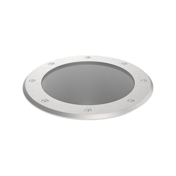 Luminaire encastré de sol avec cadre pour application extérieur, avec projection de lumière ascendant. Collorette extérieur en acier inoxydable. Corps en aluminium injecté. Verre trempé. Boîte d’encastrement en PVC. Cette installation nécessite un espace de drainage avec gravier avec au moins 20 cm.