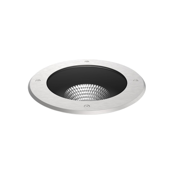 Luminaire encastré de sol avec cadre pour application extérieur, avec projection de lumière orientable ascendant. Collorette extérieur en acier inoxydable. Corps en aluminium injecté. Verre trempé. Driver intégré. Boîte d’encastrement en PVC. Cette installation nécessite un espace de drainage avec gravier avec au moins 20 cm.