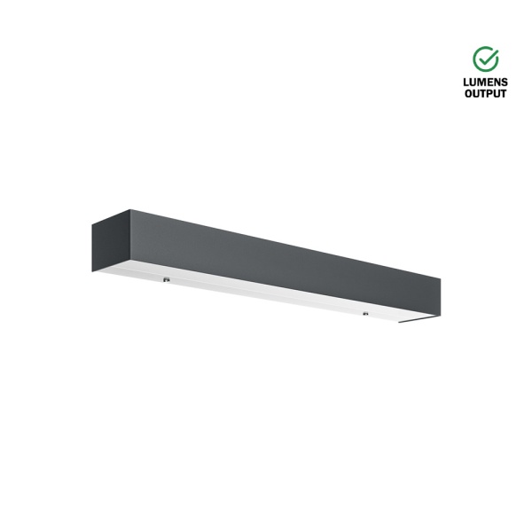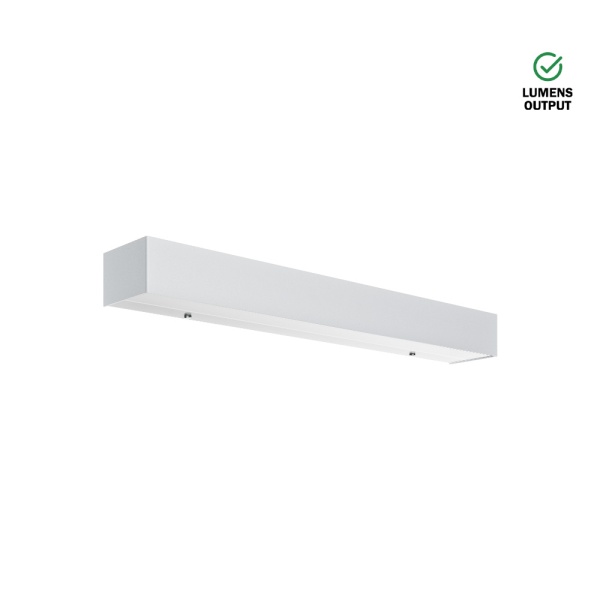 Luminária saliente de parede para aplicação em espaços interiores, com projeção de luz descendente e ascendente. Corpo em aço inox escovado ou em alumínio pintado. Difusor em acrílico opalino. Driver incorporado.