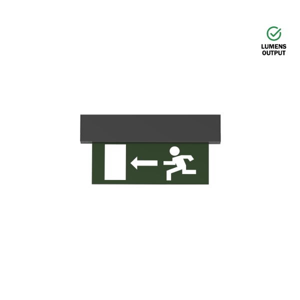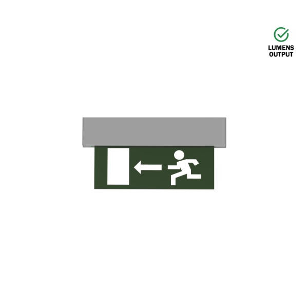 Luminária de emergência saliente de teto, para aplicação em espaços interiores, com projeção de luz descendente. Corpo em alumínio injetado com possibilidade de pintura em diversas cores. Difusor em acrílico com pictograma à escolha. Driver incorporado.