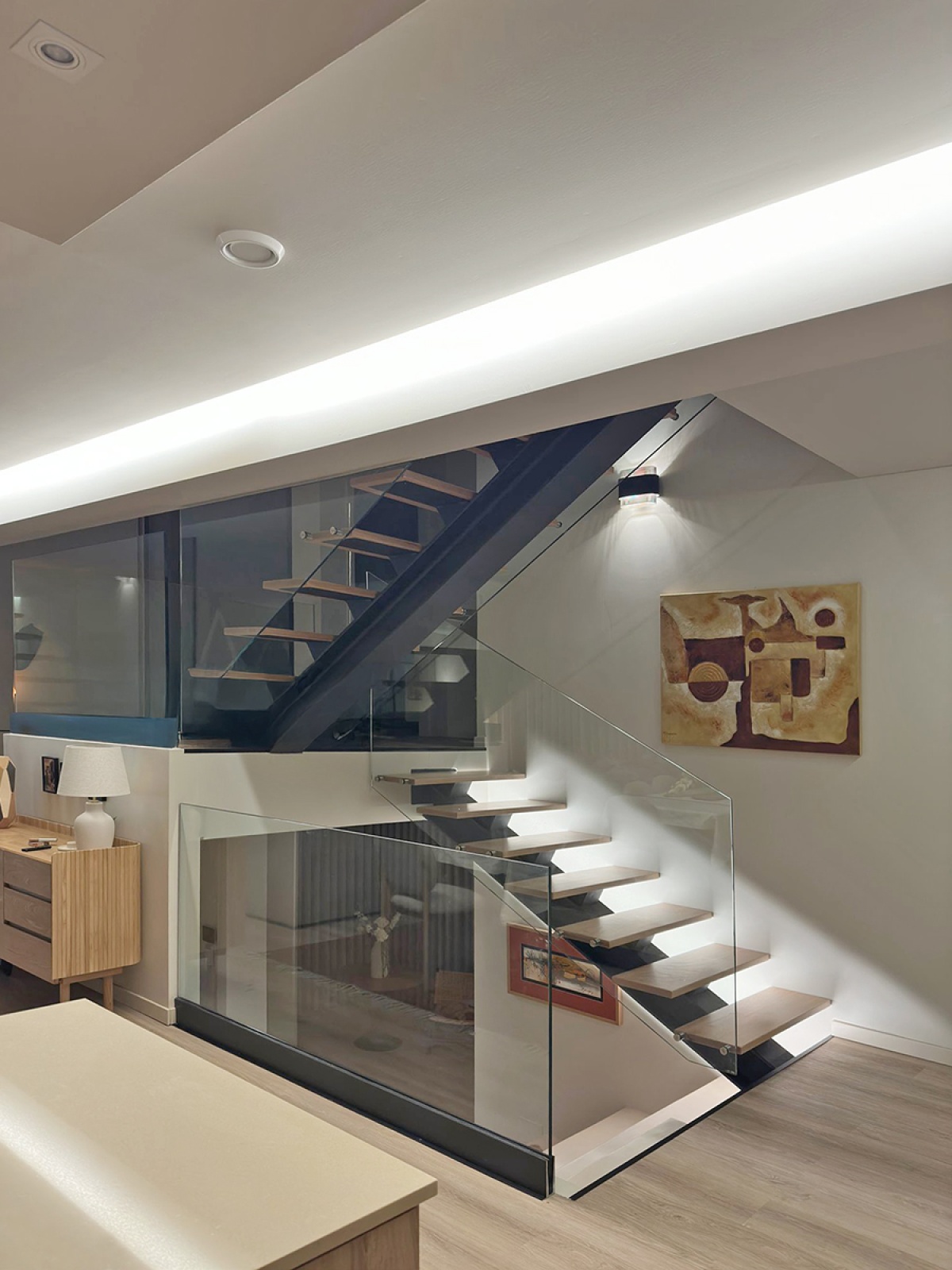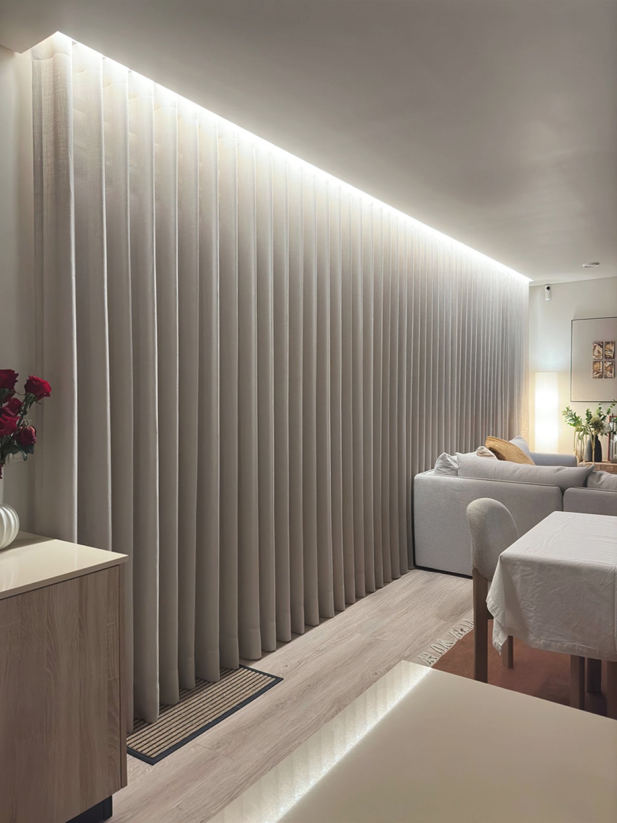Um dos principais elementos adotados no projeto foi o uso de sancas iluminadas. Esta solução permite criar uma atmosfera acolhedora e versátil, adaptando-se às diferentes necessidades do dia a dia. As sancas com sistemas LED proporcionam um efeito suave e contínuo, evitando pontos de luz diretos e garantindo um design moderno e sofisticado.